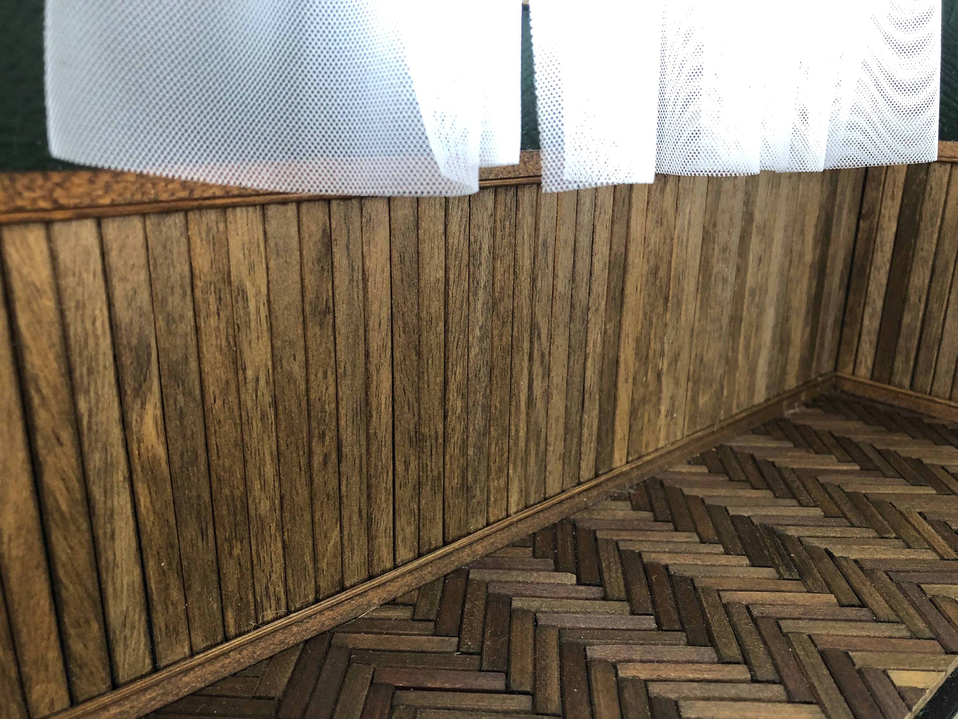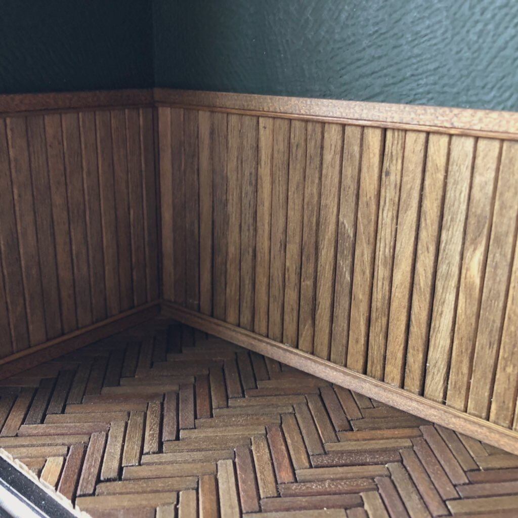 本体を開くと中は板張りの床、シックな深緑の壁紙に床板とトーンを合わせた腰板、上げ下げ窓(可動式)付きの落ち着いた室内となっております。